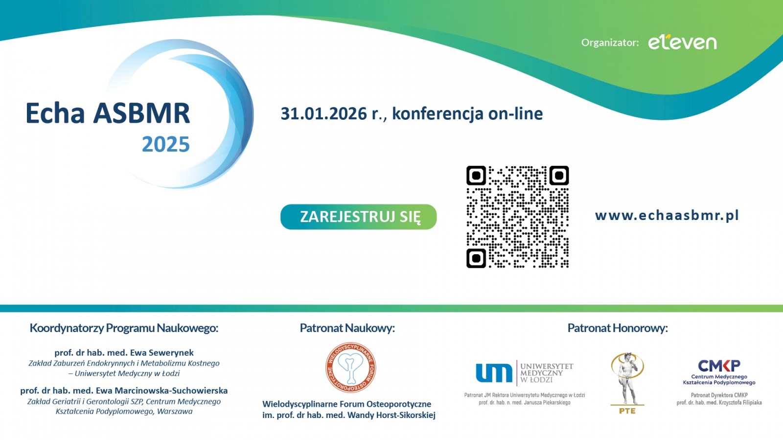 31 stycznia 2026 odbędzie się 14 Edycja Konferencji Echa American Society for Bone and Mineral Research (ASBMR) pod patronatem Honorowym JM Rektora Uniwersytetu Medycznego w Łodzi, prof. dr hab. med. Janusza Piekarskiego, Dyrektora CMKP prof. dr hab. med. Krzysztofa Filipiaka oraz Polskiego Towarzystwa Endokrynologicznego. Program Naukowy został przygotowany przez Prof. Ewę Sewerynek i prof. Ewę Marcinowską – Suchowierską, które od wielu lat w ramach działalności Stowarzyszenia „Wielodyscyplinarne Forum Osteoporotycznego im. Prof. Wandy Horst-Sikorskiej”, na podstawie materiałów prezentowanych podczas ASBMR (ostatni ASBMR, Seattle, WA, USA, 05-08 wrzesień 2025) przygotowują Echa ASBMR w Polsce, a do czynnego udziału w jego realizacji zapraszają Polskich Ekspertów. W tym roku skoncentrujemy się na postępach wiedzy w zakresie diagnostyki i leczenia chorób metabolicznych kości, ale nie tylko osteoporozy. Omówimy również inne choroby kości, dotykające nie tylko osoby dorosłe, ale także dzieci.