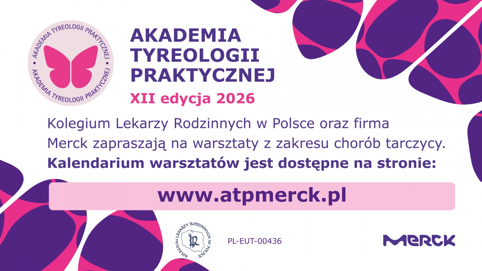 W imieniu Kolegium Lekarzy Rodzinnych w Polsce i firmy Merck miło nam poinformować o kolejnej, XII edycji Akademii Tyreologii Praktycznej 2026. Program porusza zagadnienia o tematyce tyreologicznej i endokrynologicznej, został objęty patronatem naukowym Polskiego Towarzystwa Endokrynologicznego oraz Polskiego Towarzystwa Tyreologicznego.